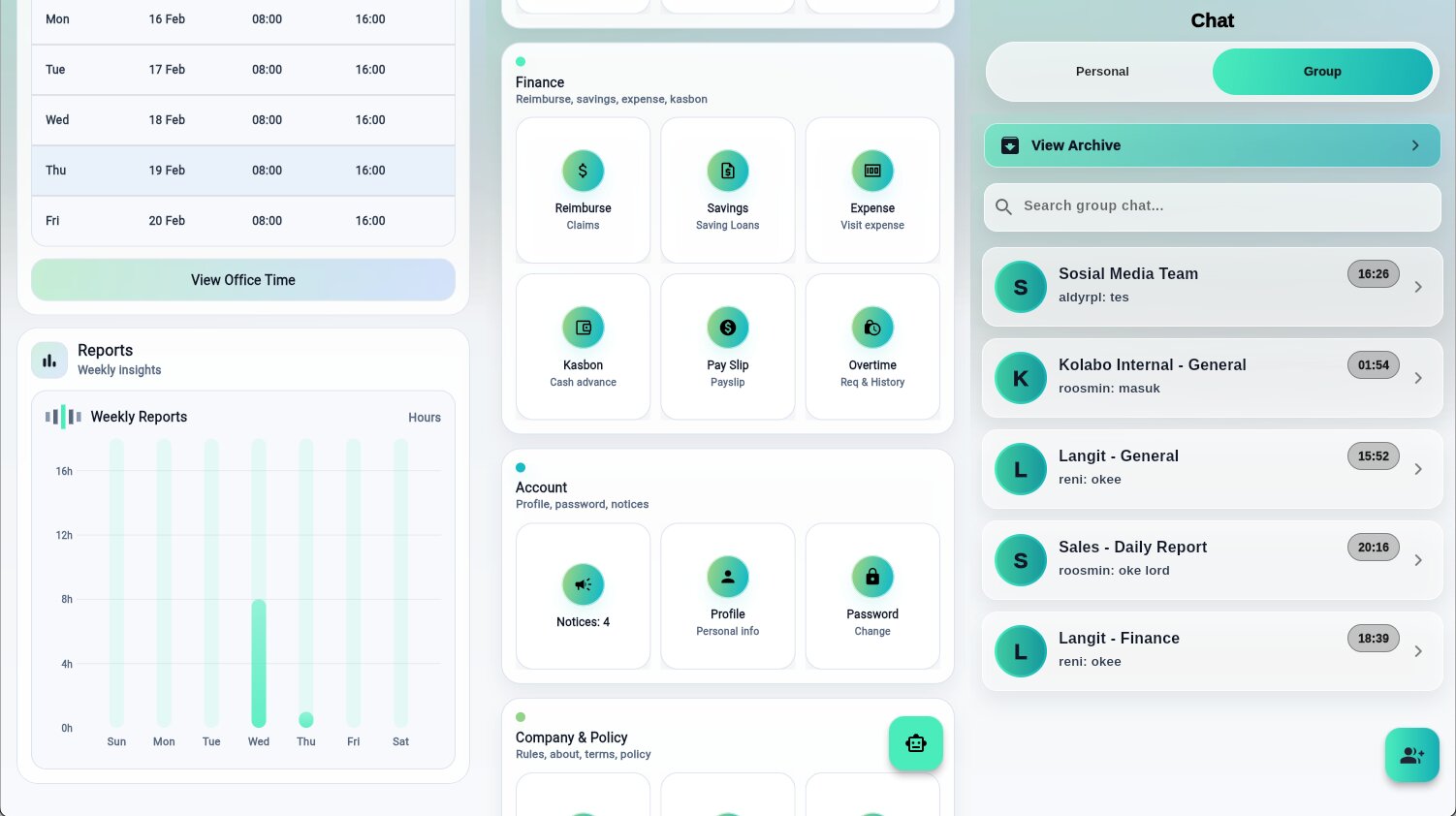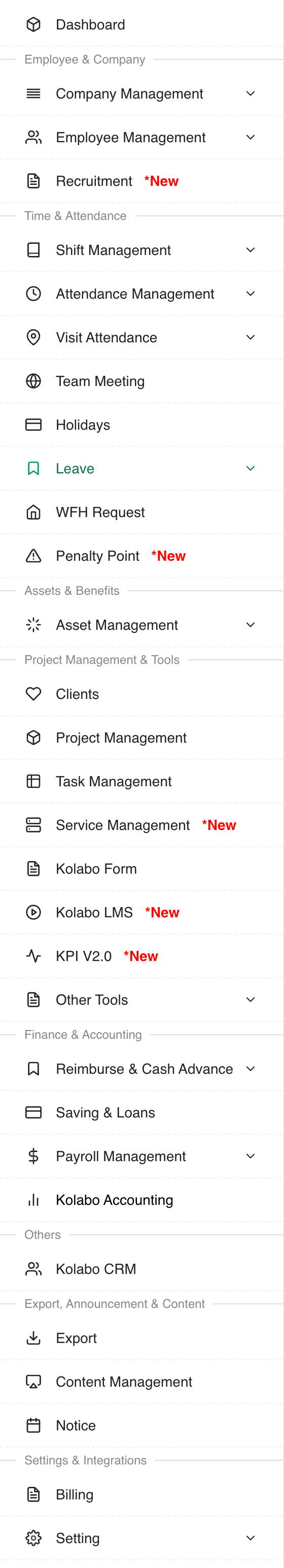 HRM | Accounting | CRM | Attendance | Payroll | Task Management | Personal & Group Chat | Leave & Reimbursement | Save & Loans | Kolabo Form | Kolabo Meet | Kolabo AI | Kolabo Terminal | Kolabo Cloud | Reporting
