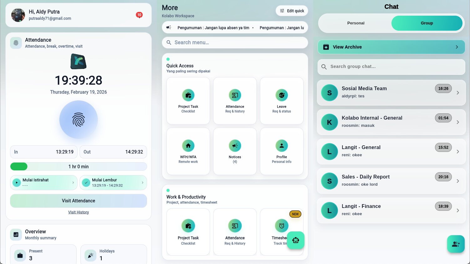 Lelah mengatur karyawan? karyawan kurang disiplin dan Anda tidak sempat memonitoring semua progress kerjaan? Kolabo sangat dapat diandalkan untuk mengatur perusahaan Anda dan meningkatkan produktivitas perusahaan / bisnis Anda. Kolabo sangat cocok dan membantu semua divisi mulai dari Direktur, Management, HR, Finance dan Staff dan Kolabo cocok untuk semua lini bisnis usaha mulai dari UMKM hingga Perusahaan Besar dengan ribuan karyawan. Tidak hanya itu Kolabo juga mempunyai banyak fitur.